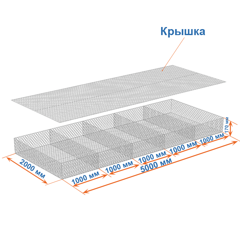 Матрасы Рено 5x2x0,17 — плоские габионные секции из сетки двойного кручения с ячейкой 80х100, проволокой 2,7 мм и покрытием Цинк.