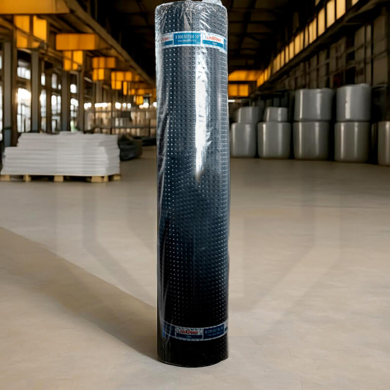 К поверхности геомембраны прикреплен слой геотекстиля, он служит для первичного сбора и отвода влаги. Геотекстиль собирает влагу и отводит ее по дренажным каналам профилированной геомембраны Geo.